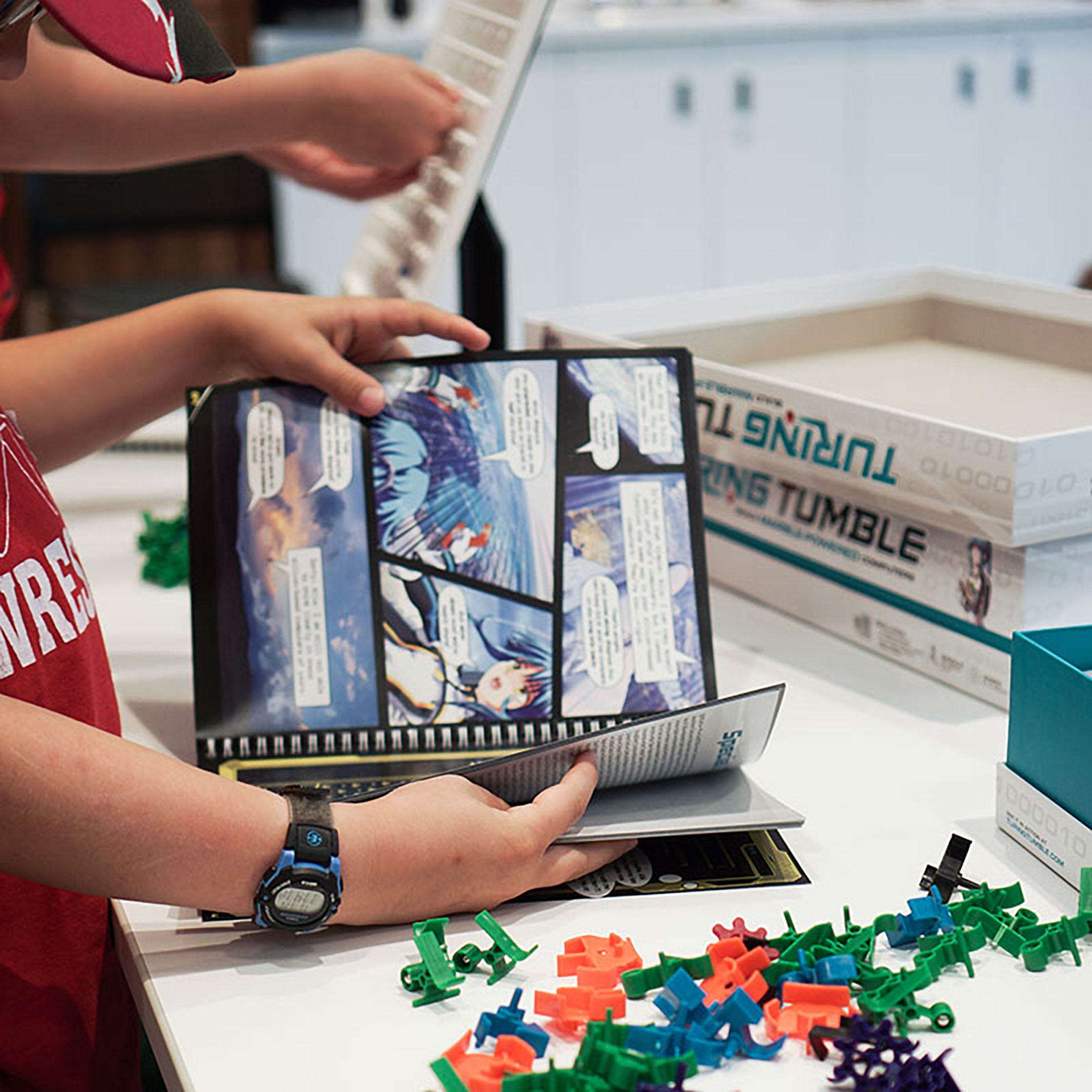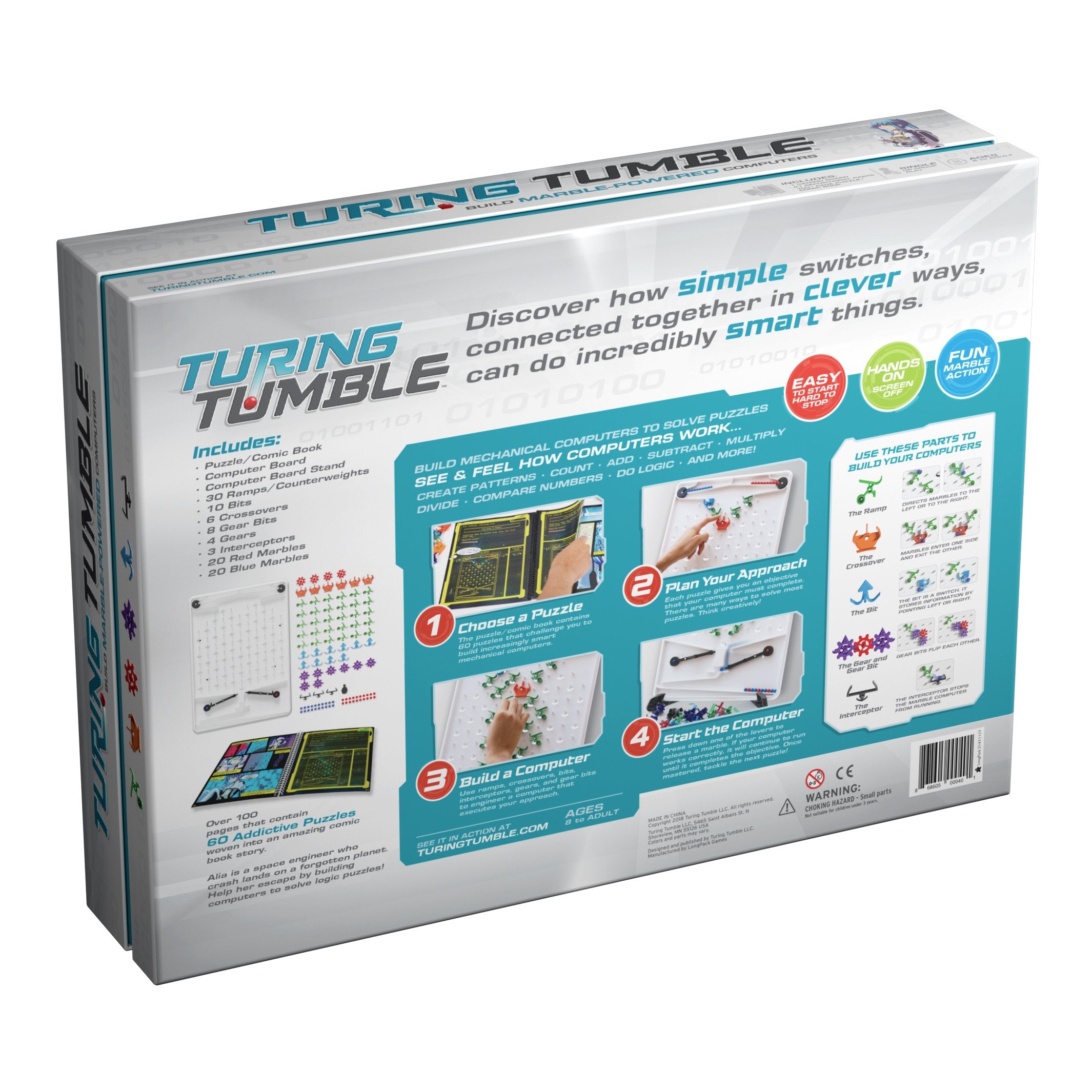 Turing Tumble is a new type of game where players (ages 8 to adult) build mechanical computers powered by marbles to solve logic puzzles. Use ramps, crossovers, bits, interceptors, gears, and gear bits to build marble-powered computers that can generate patterns, do logic, count, add, subtract, multiply, divide, and much, much more!